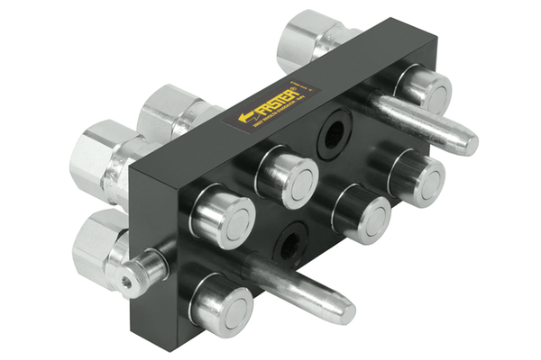 Multicoupleur à joint plat, faible fuite d'huile. Couplage simultané de plusieurs conduites hydrauliques et connexion de conduites électriques avec sécurité d'inversion. Peut être couplé sous pression (dans la version 3 P) ! Fermeture des deux côtés, couplage facile et