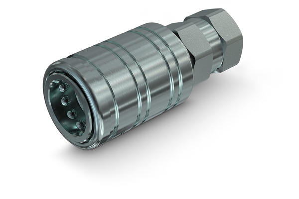 Raccords pour connexion push-pull, connexion avec bouchon avec pression résiduelle, grâce ŕ un verrouillage mécanique ŕ l'intérieur de la vanne. Fonction de protection contre l'arrachement des tuyaux.
